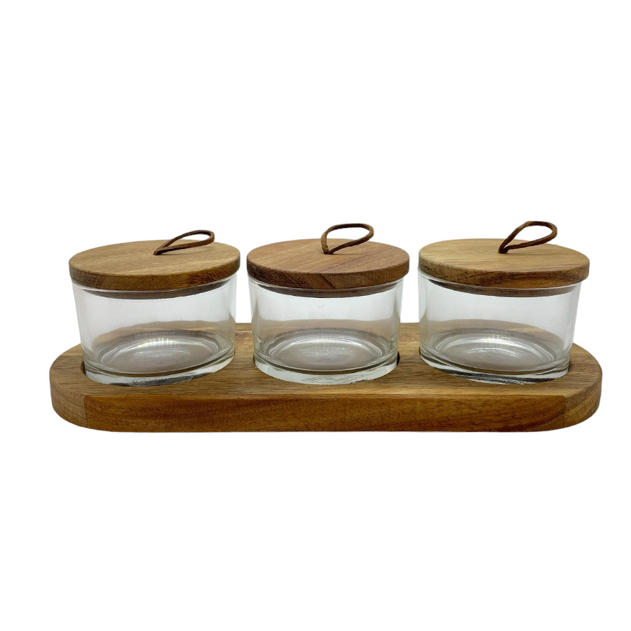 Jogo de 3 petisqueiras em vidro com tampa e bandeja de madeira