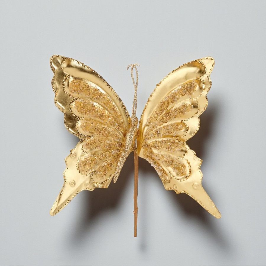 O Galho Decorativo Borboleta Dourada com Glitter é um acessório charmoso, versátil e iluminado, ideal para quem busca uma decoração natalina refinada e cheia de estilo.