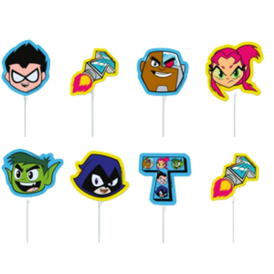 Pick decorativo Jovens Titãs GO!, com 8 unidades no total. O kit inclui 1 pick de cada personagem principal, 2 da Torre dos Titãs e 1 da torre com os rostos dos heróis estampados. Ideal para enfeitar doces, cupcakes ou compor arranjos temáticos em festas infantis.