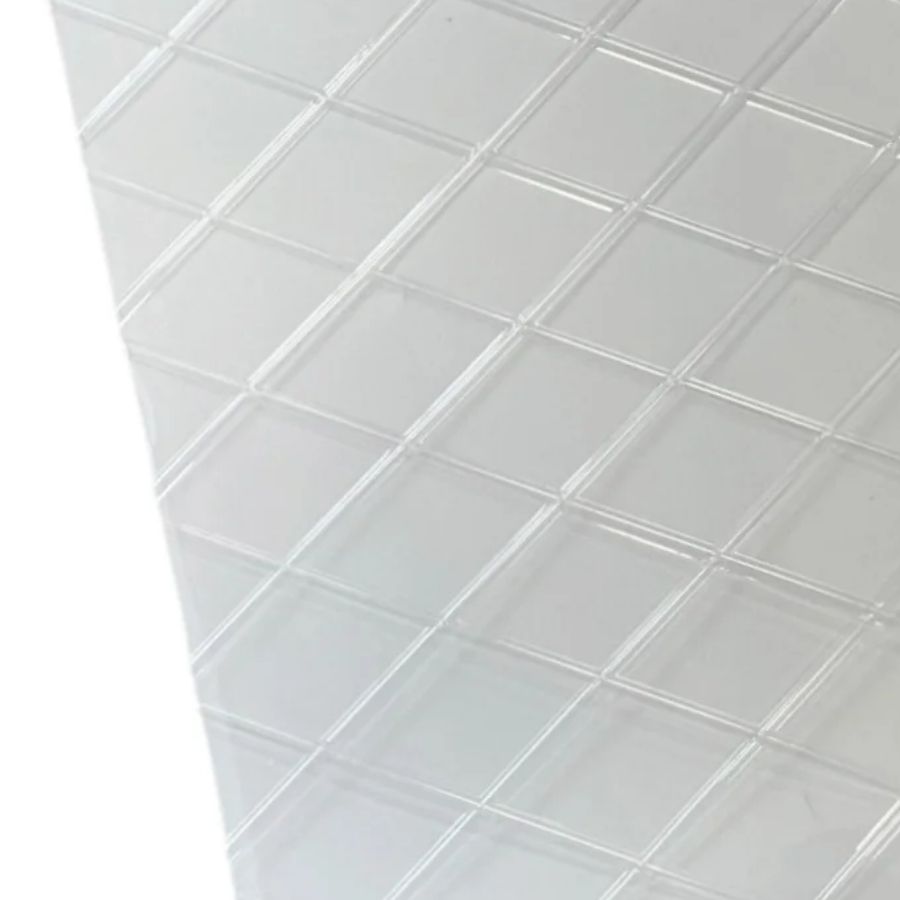 A Placa de Textura Losango é uma ferramenta reutilizável que aplica padrão elegante ao chocolate. Com 48cm, é ideal para acabamento profissional e produção eficiente.