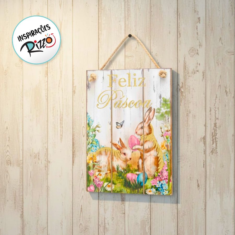 Placa Decorativa em MDF Coelhos Feliz Páscoa - 01 unidade - Cromus Páscoa - Rizzo Embalagens
