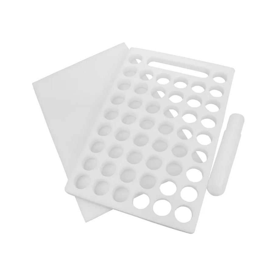 Placa porcionadora de doces e brigadeiros na cor branca com 50 furos. Contém uma placa dosadora, uma placa de apoio e um bastão.