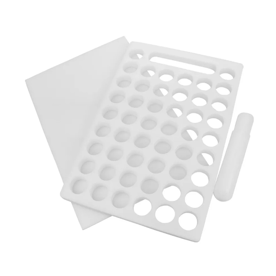 Placa porcionadora de doces e brigadeiros na cor branca com 50 furos. Contém uma placa dosadora, uma placa de apoio e um bastão.