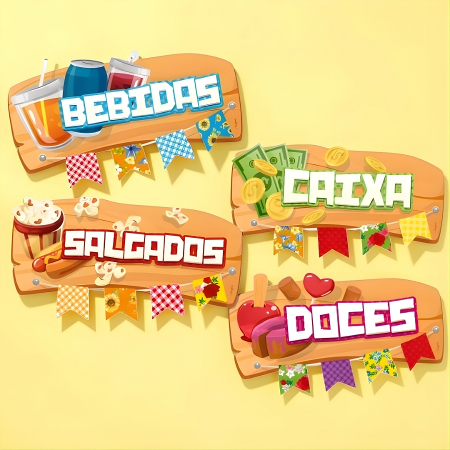 Com dimensões de 27x13cm, as placas possuem um tamanho prático para serem utilizadas em diferentes pontos da decoração. Podem ser posicionadas em mesas, paredes, entradas ou espaços temáticos, ajudando a orientar e decorar o ambiente de forma criativa durante a celebração de São João.