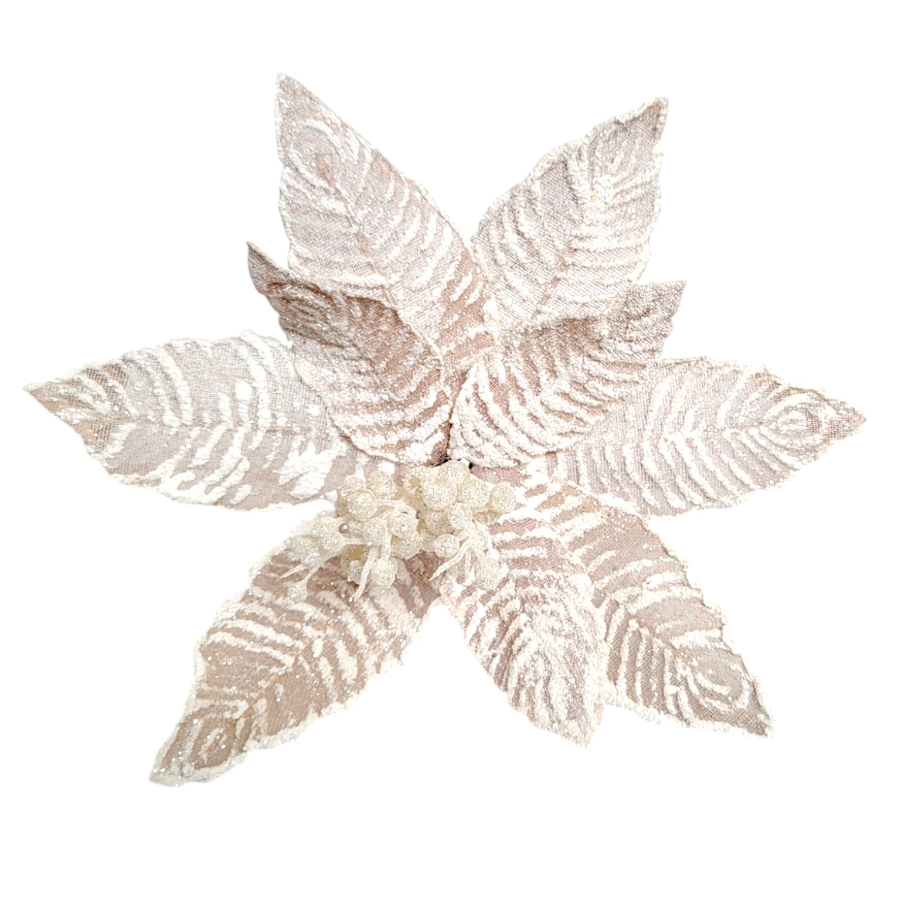 Flor decorativa de poliester na cor champanhe com detalhes em glitter branco