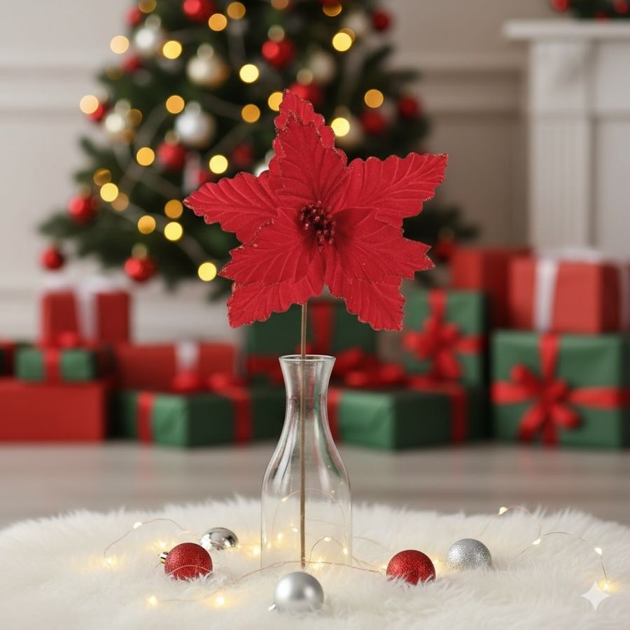 Com dimensões de 41x26x9cm, essa poinsétia é perfeita para destacar guirlandas, árvores, arranjos e centros de mesa. Seu acabamento refinado e brilho delicado adicionam um toque festivo e elegante, tornando qualquer ambiente mais acolhedor e cheio de espírito natalino.