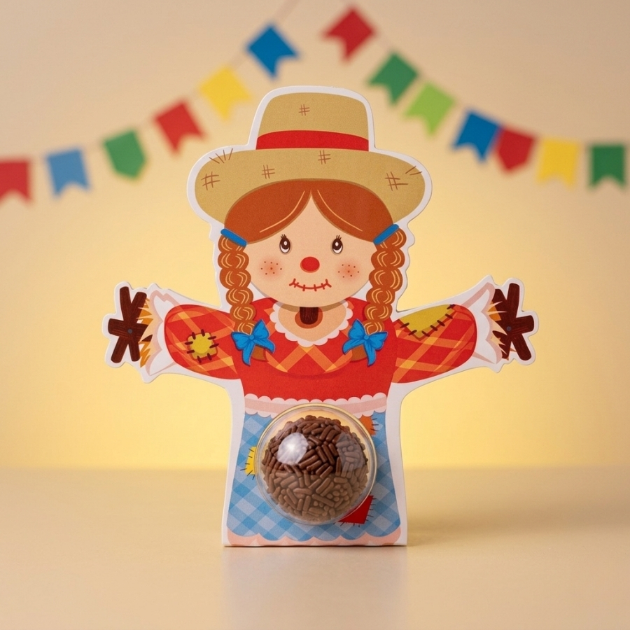 O Porta Brigadeiro 1 Cavidade com Blister Festa Junina Espantalha com 5 Unidades é perfeito para valorizar doces individuais com delicadeza, charme e um toque temático. Com estampa de espantalha, ele traz um visual lúdico, colorido e encantador, ideal para destacar brigadeiros, beijinhos e outras guloseimas em festas juninas, arraiais, eventos escolares e lembrancinhas personalizadas.