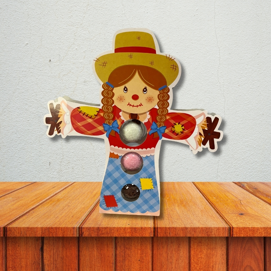 Porta brigadeiro com 3 cavidades, blister incluso, tema espantalha, tamanho 22,5x2,5x23,5cm, ideal para doces e lembrancinhas de Festa Junina.