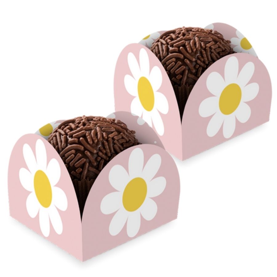 Porta forminha Margarida 3,5x3,5cm, com 50 unidades estampadas com delicadas margaridas tanto na parte interna quanto externa. Ideal para acomodar doces como brigadeiros e beijinhos, valorizando a apresentação em festas com tema floral ou primavera.