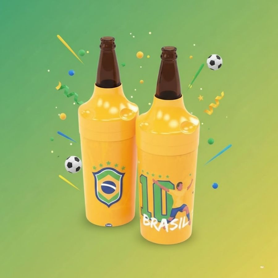 Porta garrafa decorado nas cores do Brasil, resistente e prático, ideal para festas e kits temáticos.