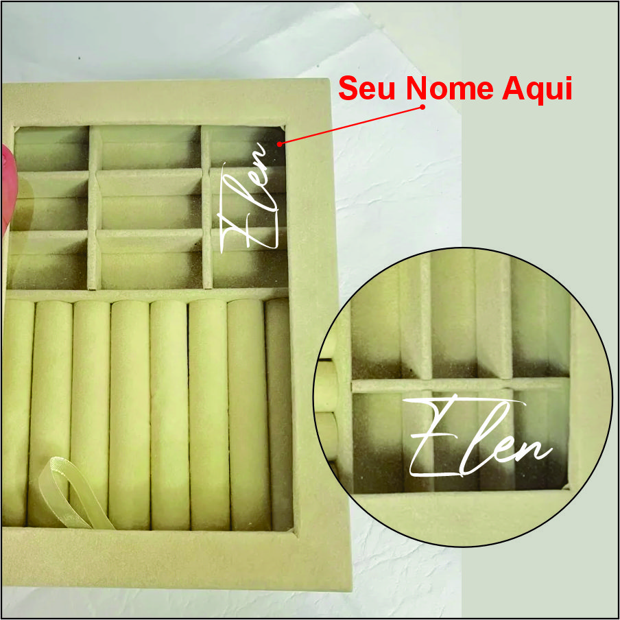 Porta jóias bege com visor transparente e personalização do nome na cor branca. Medidas: 20x4x15cm. Praticidade e sofisticação em um só produto.