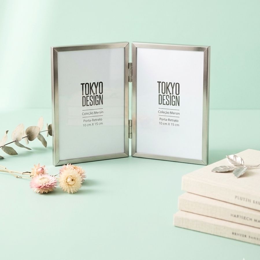 Porta-Retrato de duas faces, em metal prata para compor decorações de ambientes
