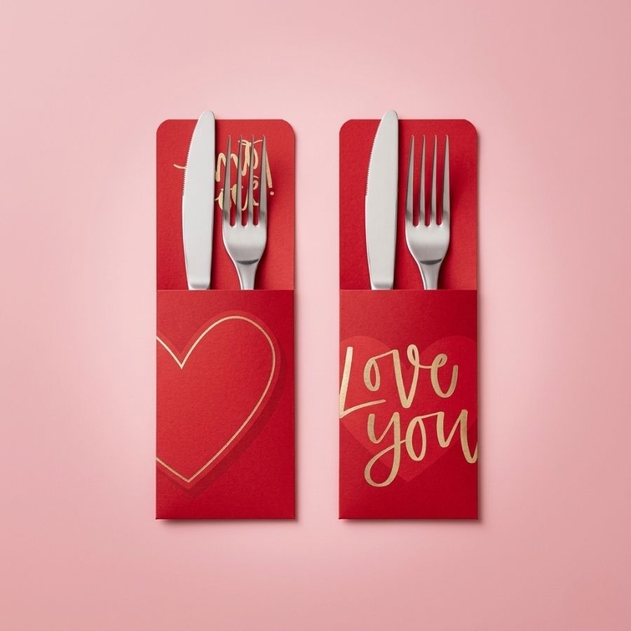 Porta Talheres Romântica da Cromus com 8 unidades, em papel cartão com pigmento colorido. Ideal para organizar talheres em datas especiais, combinando charme, praticidade e estilo.