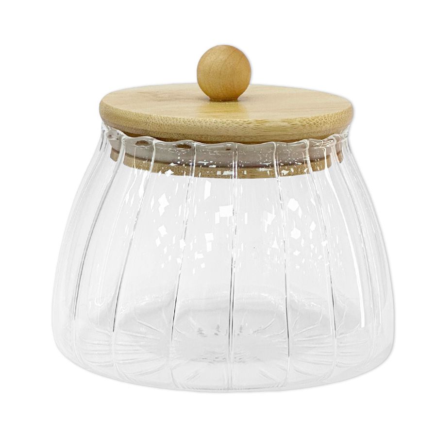 Pote de Vidro Bojudo Canelado hermético com tampa de bambu