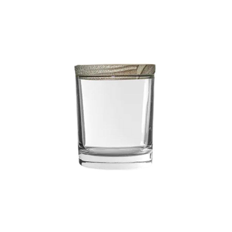 Pote redondo de vidro transparente com tampa de madeira, 300ml. Ideal para velas artesanais, kits personalizados e composições decorativas com visual natural e sofisticado.