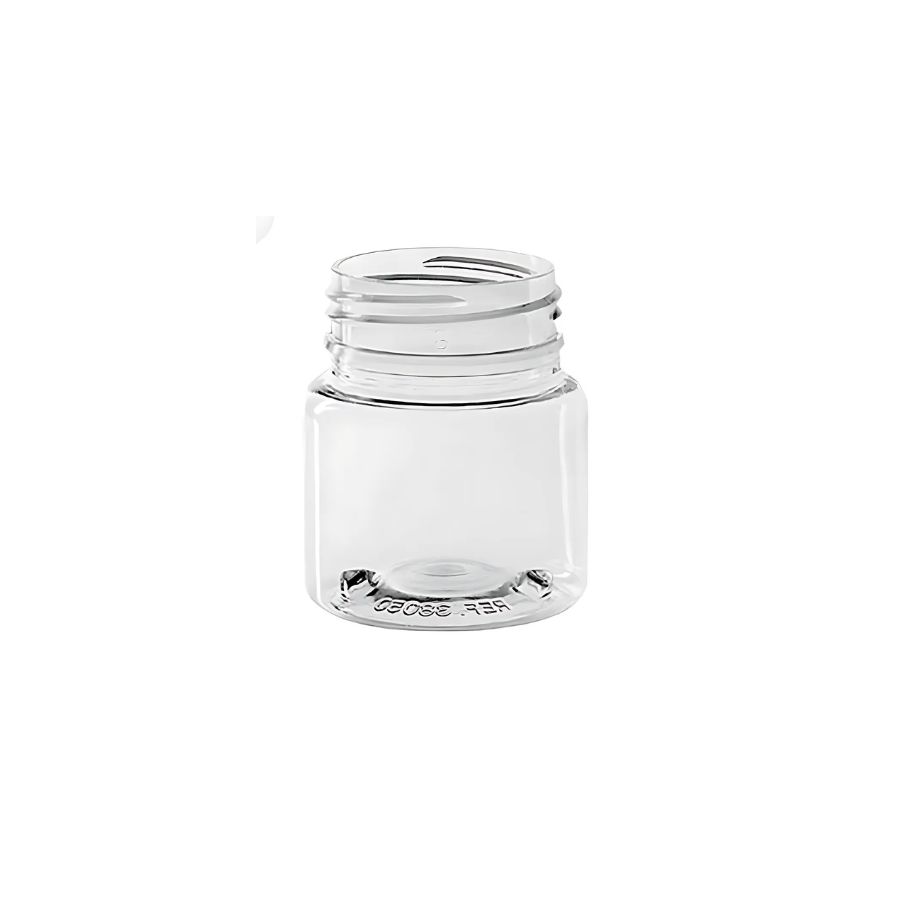 Pote PET transparente de 50ml com rosca 38, indicado para cremes e cosméticos pastosos. Medidas: 4,2 cm de altura e 5,5 cm de diâmetro. Compatível com tampas rosqueáveis padrão 38.