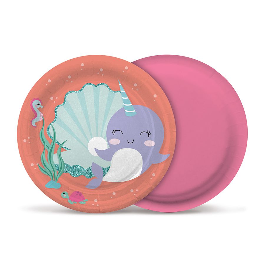 Utilize os Pratos de Papel Narval para colocar na mesa de comes e bebes ou na mesa principal para completar a decoração.