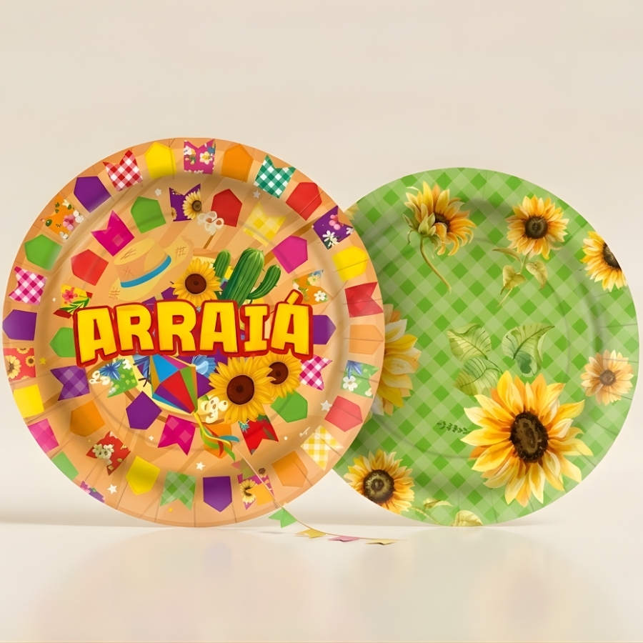 Prato descartável fabricado em papel, com formato redondo e temática Arraiá. Possui dimensões aproximadas de 18x18cm. Indicado para servir alimentos em festas juninas e eventos temáticos. Produto descartável de uso único. Recomenda-se evitar contato prolongado com alimentos muito úmidos ou líquidos para preservar a integridade do material.