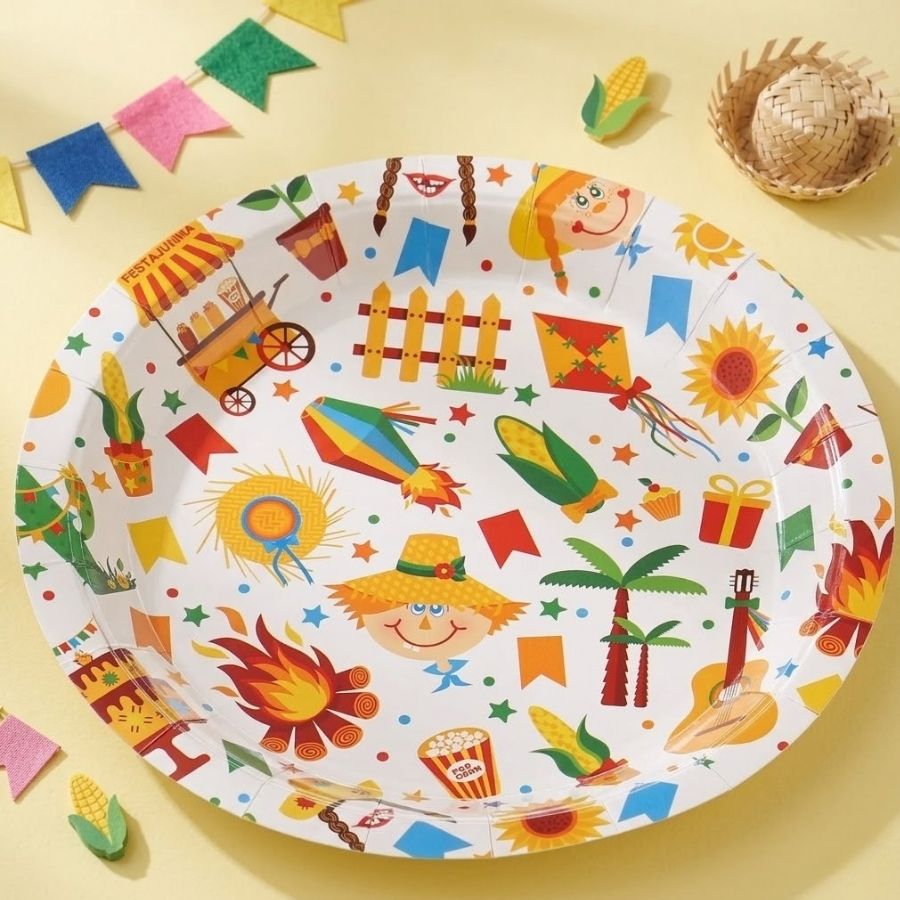 Perfeito para servir doces típicos, bolo, milho, pamonha, canjica, salgadinhos e outras delícias, o prato junino decorado é indispensável em arraiais, quermesses, festas escolares, eventos temáticos e até em lembrancinhas personalizadas. Dica prática: combine com copos, guardanapos e bandejas no mesmo tema para criar uma mesa harmoniosa e encantadora. Também é ideal para kits individuais, facilitando a distribuição dos alimentos aos convidados. Versátil, prático e com visual temático encantador, o prato de papel festa junina é essencial para compor uma decoração bonita e funcional em qualquer evento junino.