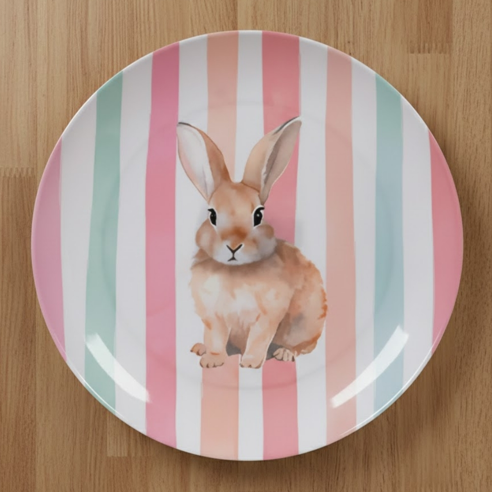 O Prato de Sobremesa de Páscoa em Melamina Coelhinho Listras é uma peça delicada e cheia de charme, ideal para compor mesas de Páscoa com visual leve e alegre. O destaque fica para o coelhinho decorativo com estampa de listras, em uma paleta suave de tons pastel nas cores rosa, laranja, vermelho e verde.