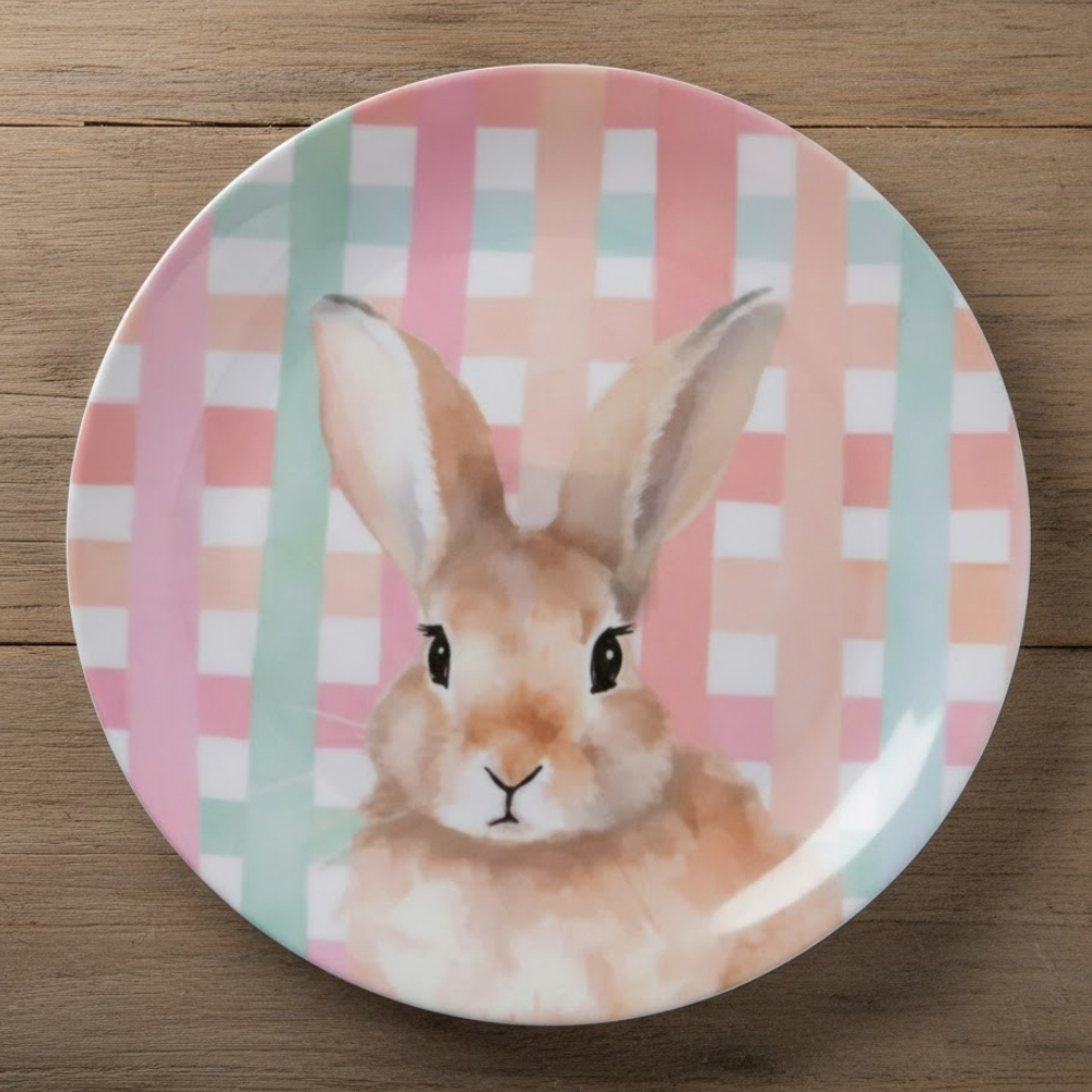 O Prato de Sobremesa de Páscoa em Melamina Coelhinho Xadrez é uma peça charmosa e delicada, perfeita para mesas de Páscoa com estilo alegre e acolhedor. O prato traz um coelhinho decorativo com estampa xadrez, utilizando tons pastel de rosa, laranja, vermelho e verde, criando um visual harmonioso e encantador.