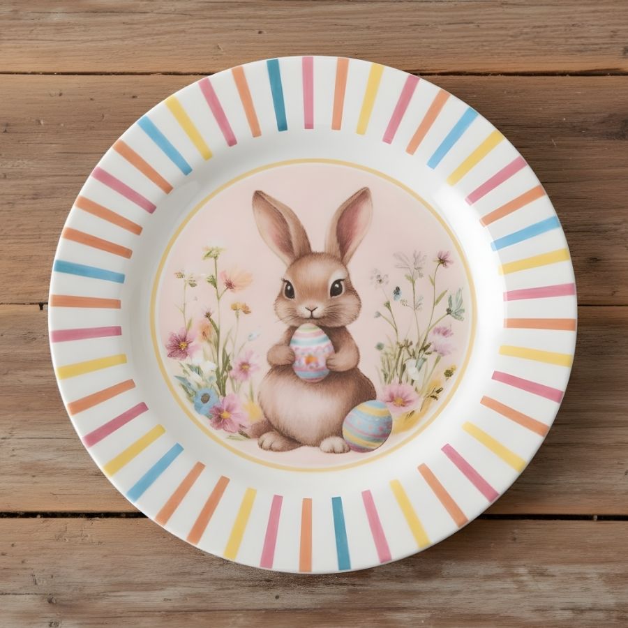Produto decorativo no formato de mini prato, com tema de coelho com ovo, medindo 17cm, indicado para uso em decoração de Páscoa e composições temáticas.