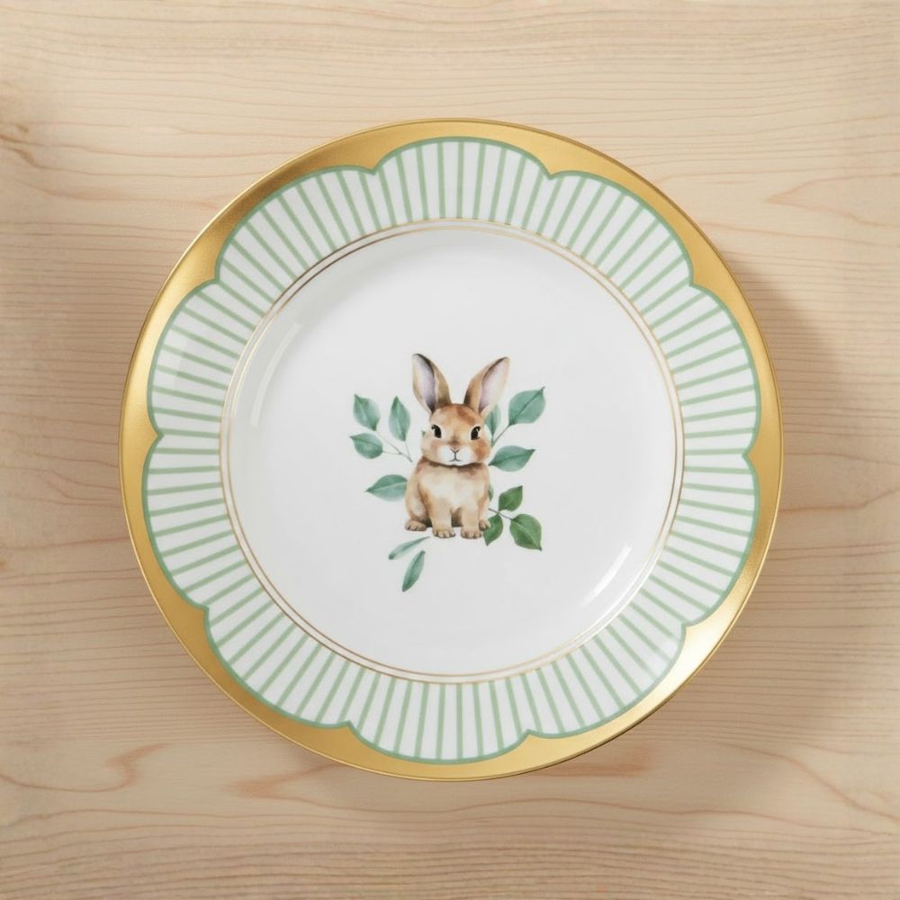 O Prato de Sobremesa de Melamina é uma peça temática e elegante, perfeita para compor mesas especiais de Páscoa. No centro, apresenta um coelho delicado, enquanto as bordas listradas em verde com detalhe dourado em toda a borda trazem sofisticação e charme à peça.