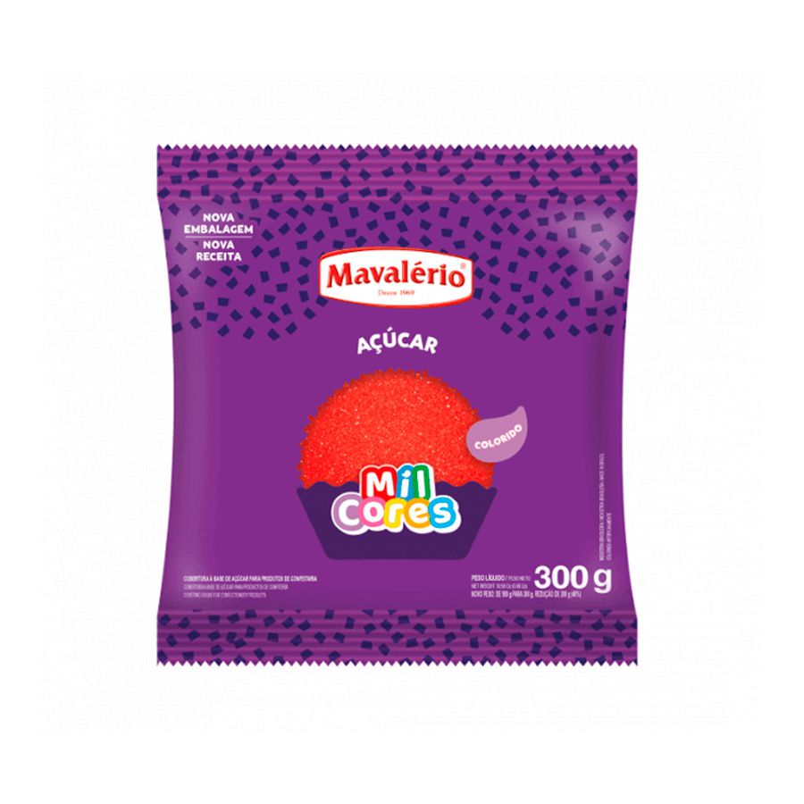 Cobertura Vermelha à Base de Açúcar para Produtos de Confeitaria - Ingredientes: Açúcar, glicose em pó, corante vermelho 40 (INS 129), umectante glicerol (INS 422) e espessante goma arábica (INS 414).
