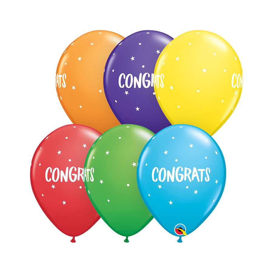 1 pacote com 50 unidades do balão Congrats (Parabéns) com pontos e estrelas nas cores sortidas.