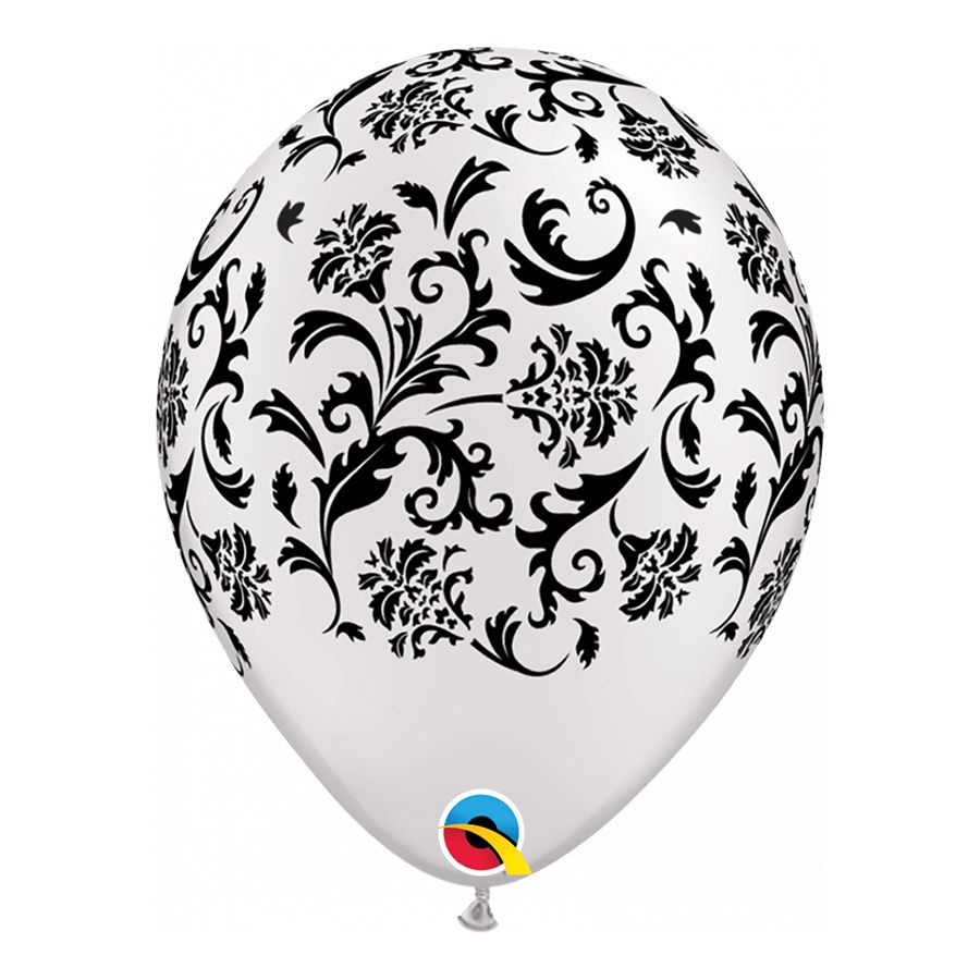 Látex 11 polegadas, aproximadamente 27 cm Contém 50 unidades. 1 pacote com 50 unidades no modelo estampa de damasco na cor preto e branco Aqui tudo é de extrema qualidade. Transformamos simples momentos, em grandes realizações.
