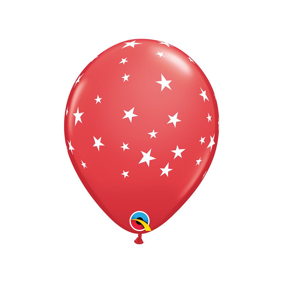 1 pacote com 50 unidades do balão Estrelas Contemporâneas na cor Vermelho e desenhos branco.
