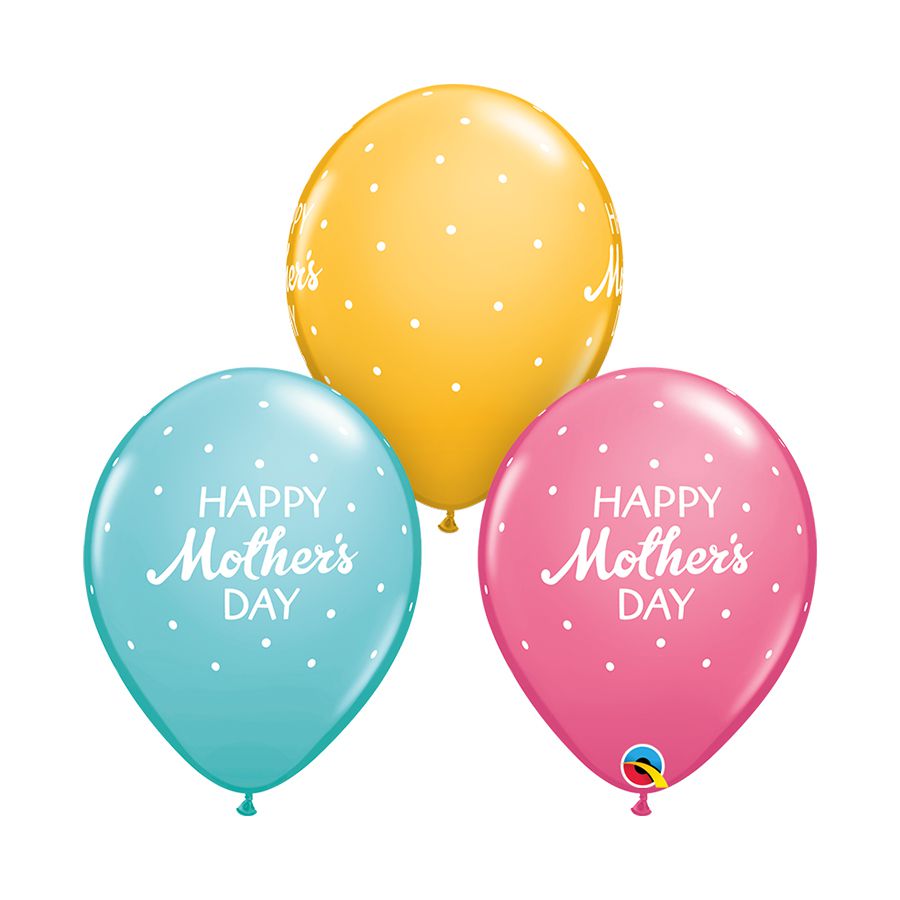 1 pacote com 50 unidades do balão Happy Mothers Day (Feliz Dia das Mães) Pontos Sortido, nas cores rosa, amarelo e azul.