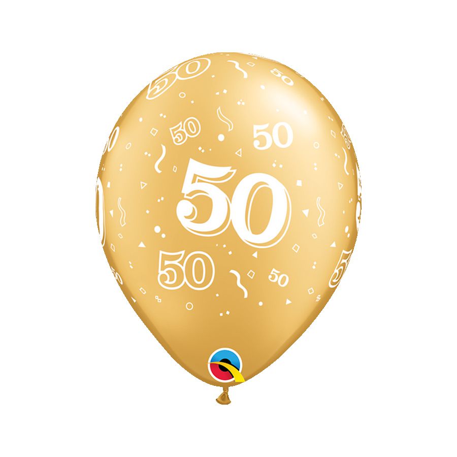 1 pacote com 6 unidades do balão com o número 50 na cor dourado.