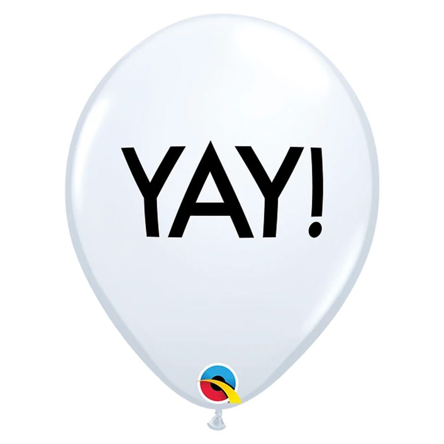 Látex 11 polegadas, aproximadamente 27 cm Contém 50 unidades. 1 pacote com 50 unidades no modelo "YAY! na cor branco Aqui tudo é de extrema qualidade. Transformamos simples momentos, em grandes realizações.