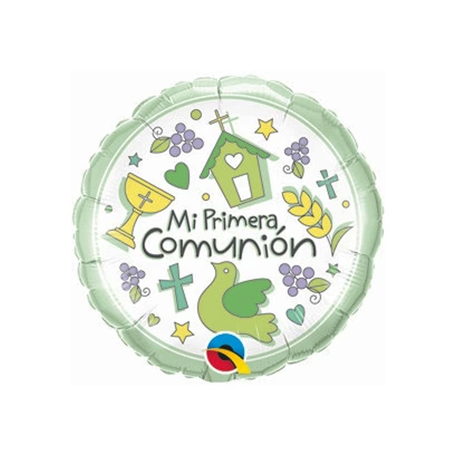 Balão microfoil no modelo redondo Minha primeira Comunhão com símbolos.