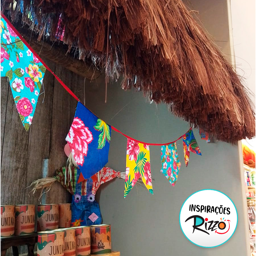 Possui 1 varal de tecido chita podendo variar as cores e estampas. NÃO SERÁ POSSÍVEL ESCOLHER A COR