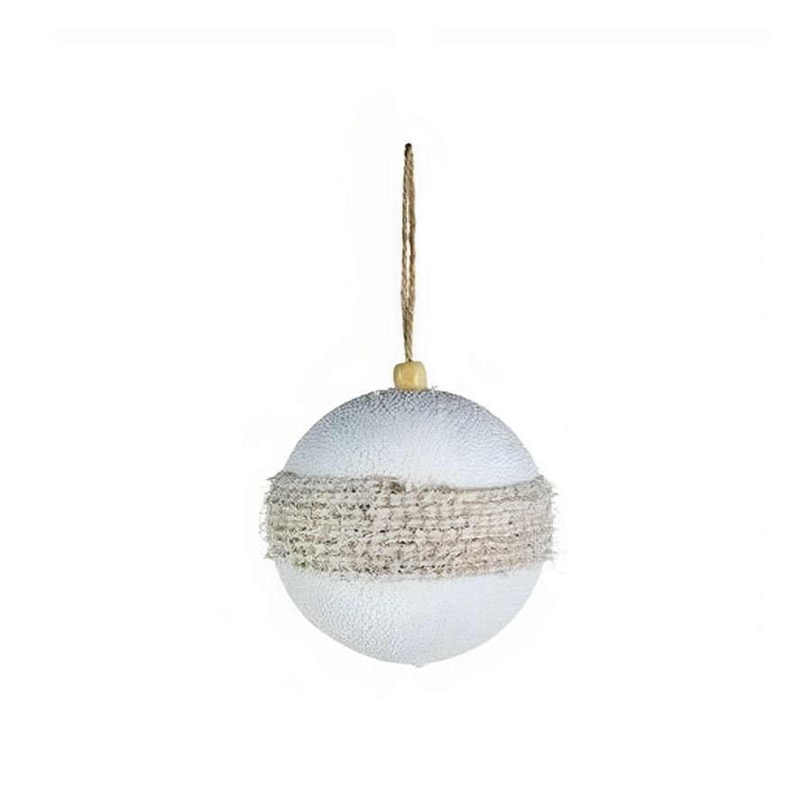 Bolas decorativas de Natal com juta e bolinhas, na cor branco e marrom. Embalagem com 4 unidades de 10 cm de diâmetro cada.
