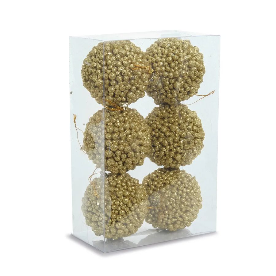 Bolas decorativas de Natal crunch, na cor ouro. Embalagem com 6 unidades de 8 cm de diâmetro cada.