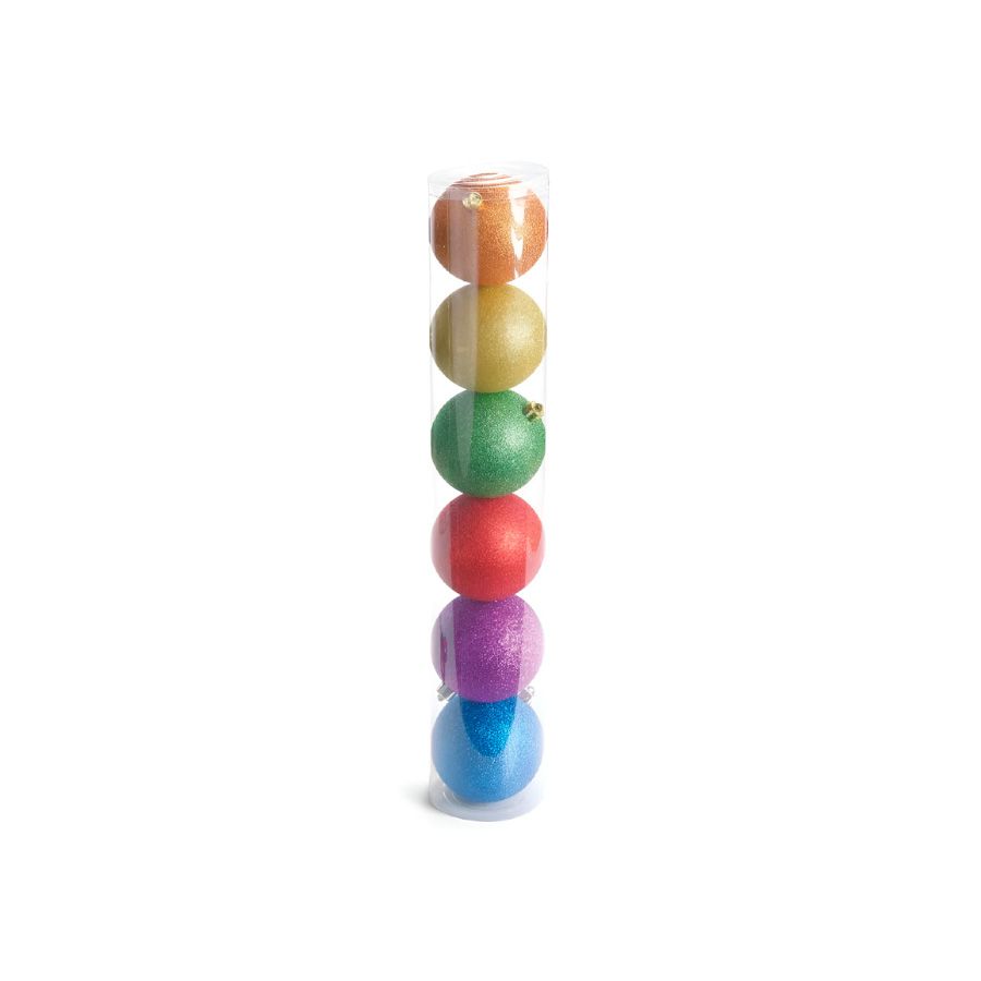Jogo de 6 peças de Bola em tubo com glitter decorativo para Natal, nas respectivas cores: Laranja, Amarelo, Verde, Vermelho, Roxo e Azul.