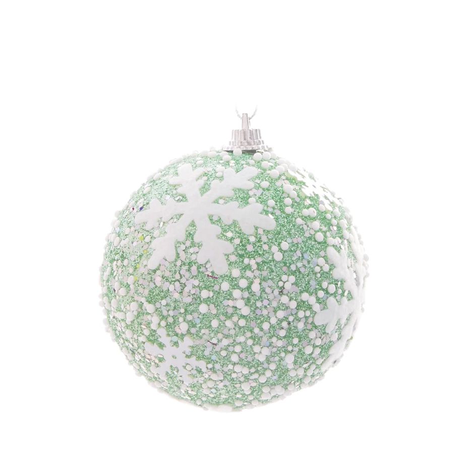 Bolas decorativas de Natal com flocos de neve, na cor verde menta. Embalagem com 4 unidades de 10 cm de diâmetro cada.