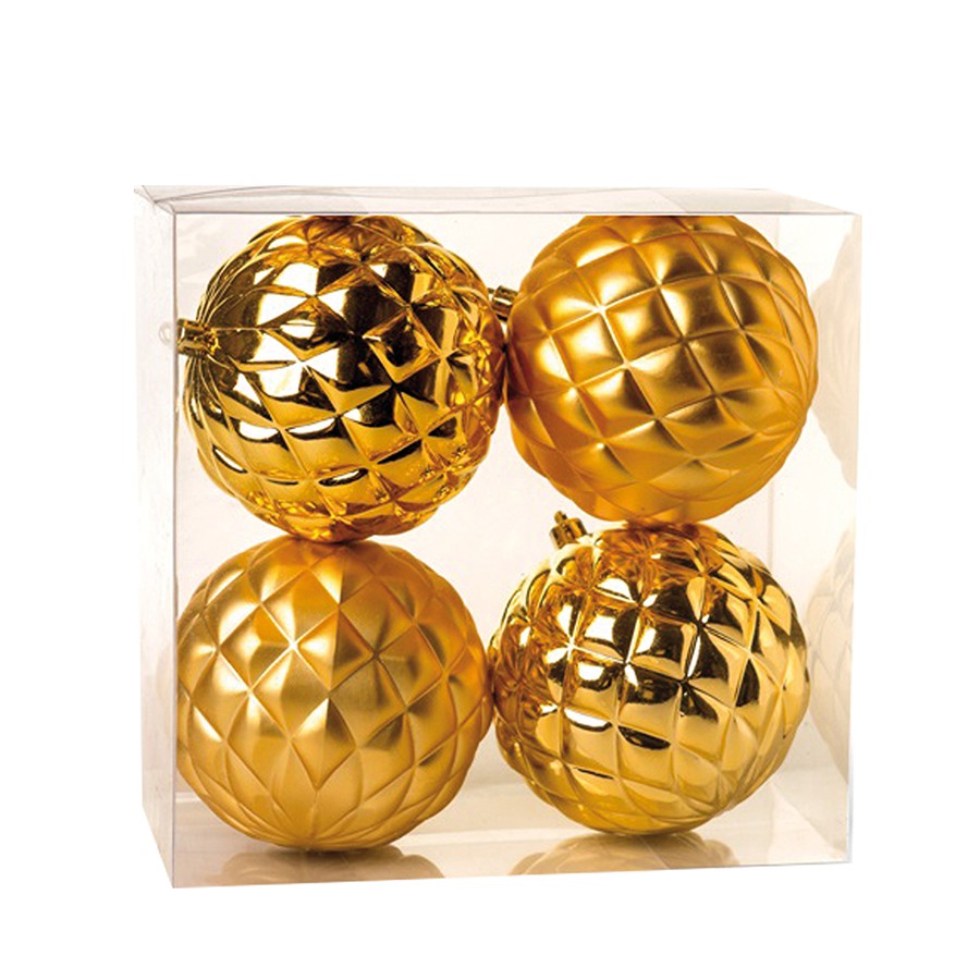 Bola de Natal com desenhos de losangos e cor ouro. Pacote contém 4 unidades nas medidas de 10 cm de diâmetro