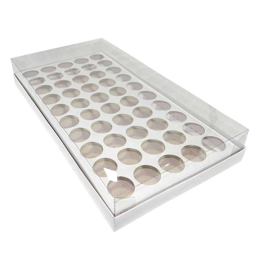 Uma caixa para brigadeiro branca com tampa transparente tendo 50 cavidades
