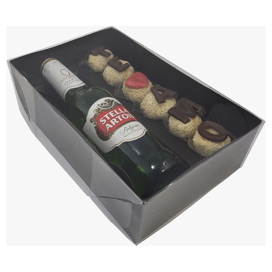 A caixa com tampa transparente garrafa ou lata + doces é uma ótima pedida para presentear aquelas pessoas que apreciam uma boa bebida e alguns docinhos para se deliciar.