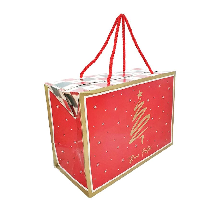 A caixa é vermelha com as bordas douradas, no centro tem uma representação de árvore de natal em dourado e embaixo a frase "Boas Festas" escrita em dourado também. Encima da caixa tem um quadriculado verde, vermelho e branco com estrelas douradas dentro dos quadradinhos brancos do quadriculado.