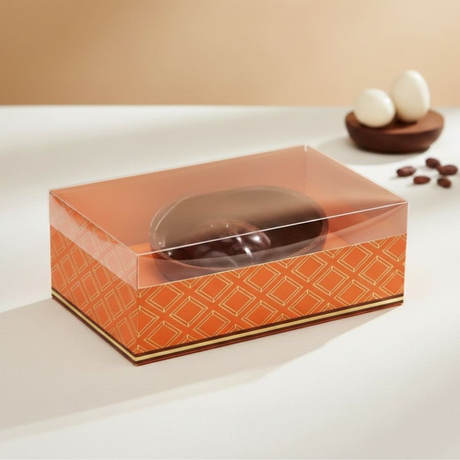 A Caixa New Practice Meio Ovo com Colher Cacau Laranja é uma embalagem moderna e funcional, ideal para valorizar a apresentação de meios ovos de chocolate com colher. Com visual sofisticado e cores inspiradas no tema cacau e laranja, ela traz destaque ao produto e eleva a experiência de presentear na Páscoa.