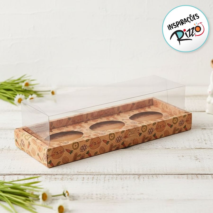 Caixa para 3 Meio Ovos de 50g a 80g em Linha com Moldura - 8x26,3x8cm - Kraft Coelhos - 5 unidades - ASSK
