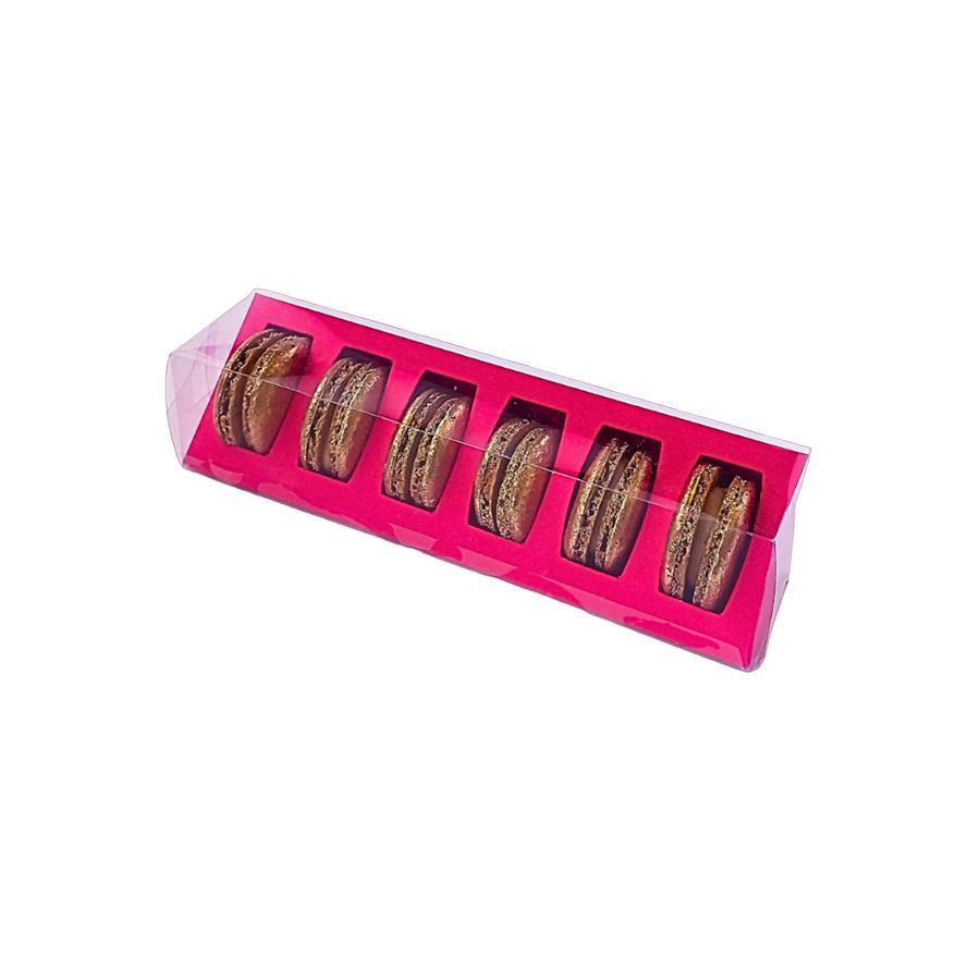 Caixa com berço para 6 macarons pink com tampa de acetato transparente com 3 unidades medindo 5cm x 21cm