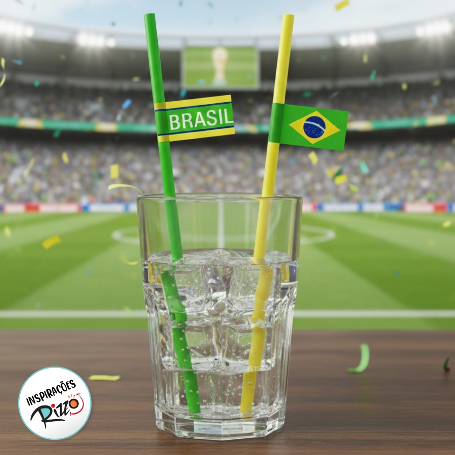Canudos verde e amarelo incríveis, em plástico, com apliques de bandeirinha. Uma maneira sutil de demonstrar para os seus clientes que está comemorando a Copa! Aumente a imersão de sua decoração com este item!