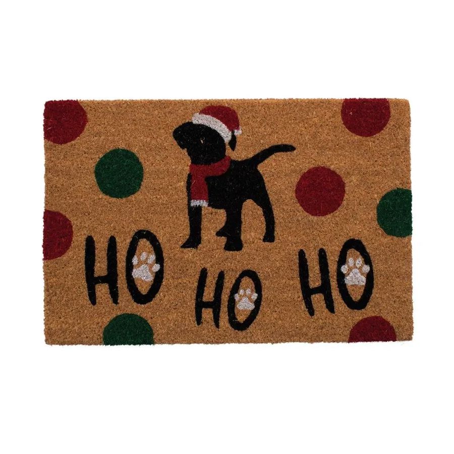 Capacho é um tapete desenvolvido especialmente para ser usado nas entradas de sua residência, permitindo que visitantes e moradores limpem os pés antes de entrar, impedindo que a sujeira da rua seja levada para a área interna. Estampa com cachorroinho natalino e a frase HoHoHo! em destaque.