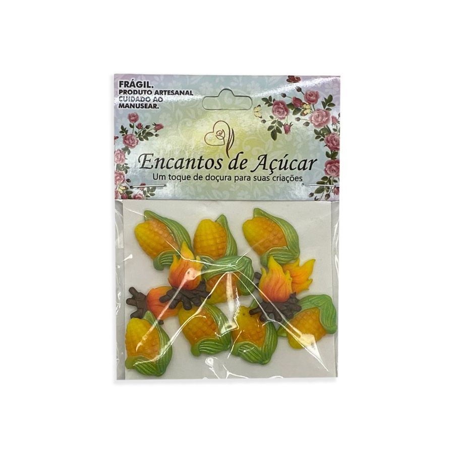 Um pacote contendo 12 unidades de confete de Festa junina com formas de fogueiras e milhos.